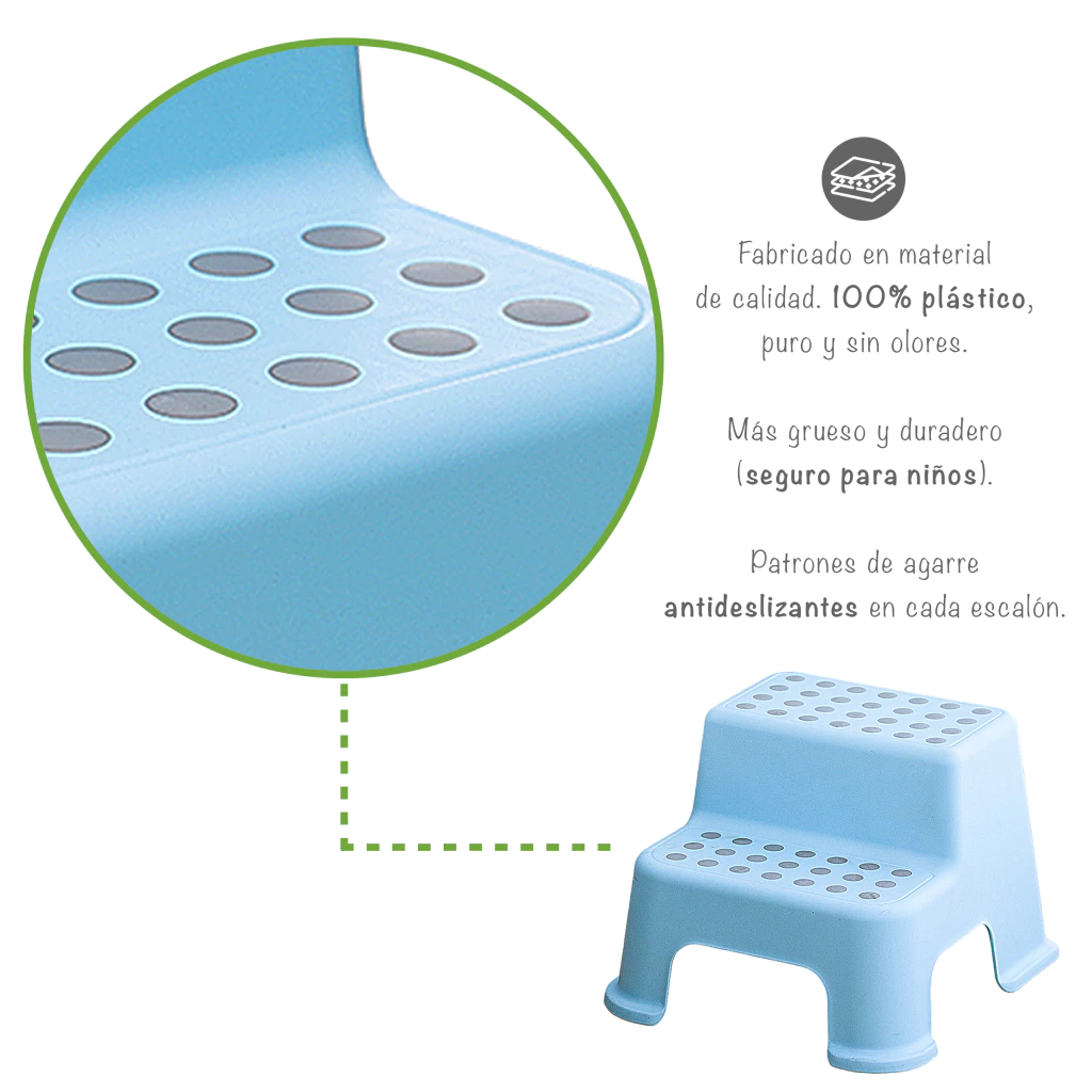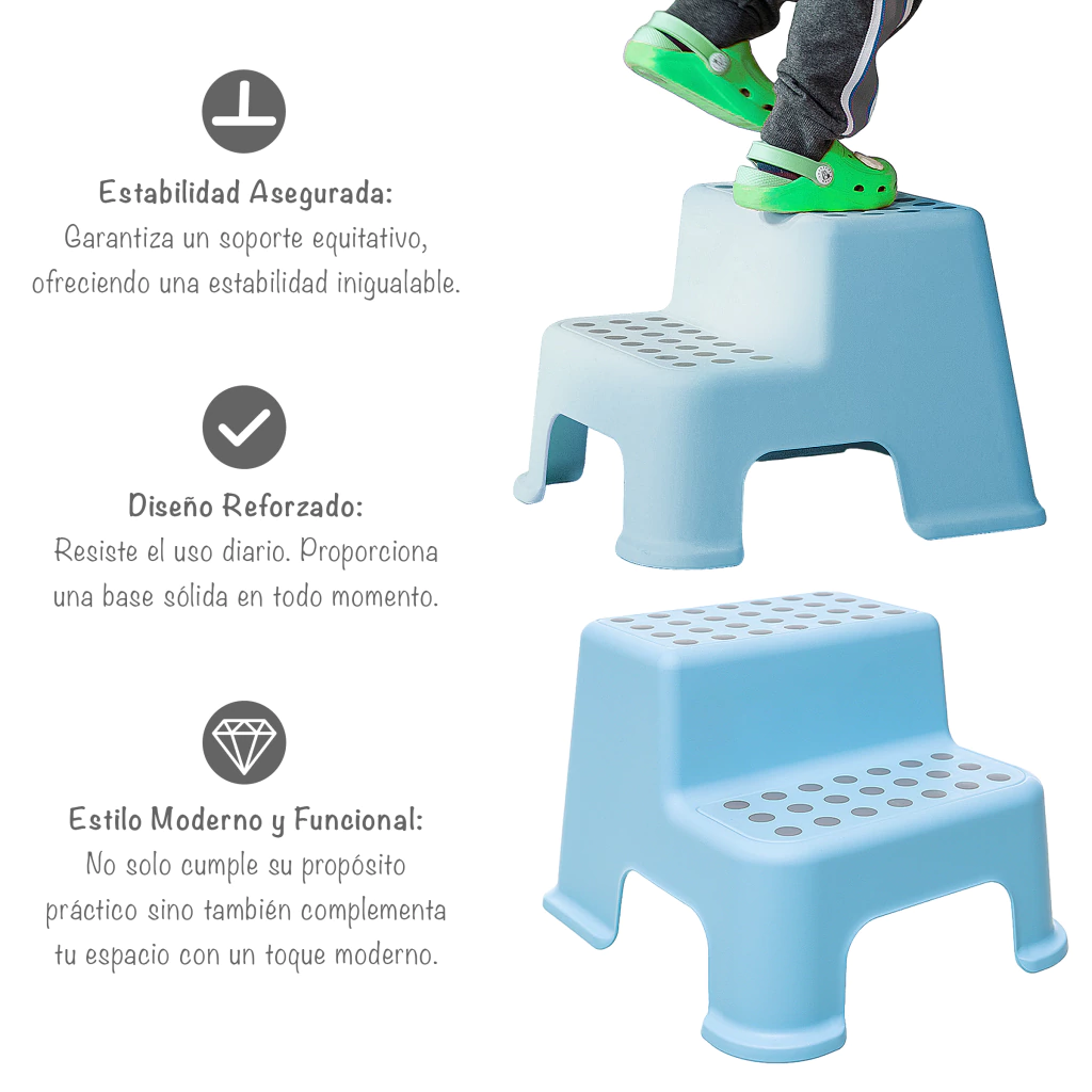 - Estabilidad sin Igual: Diseñado para brindar estabilidad, nuestro banquito cuenta con agarres antideslizantes en cada pata y patrones de agarre en cada escalón, asegurando un uso seguro incluso en áreas húmedas como el baño.