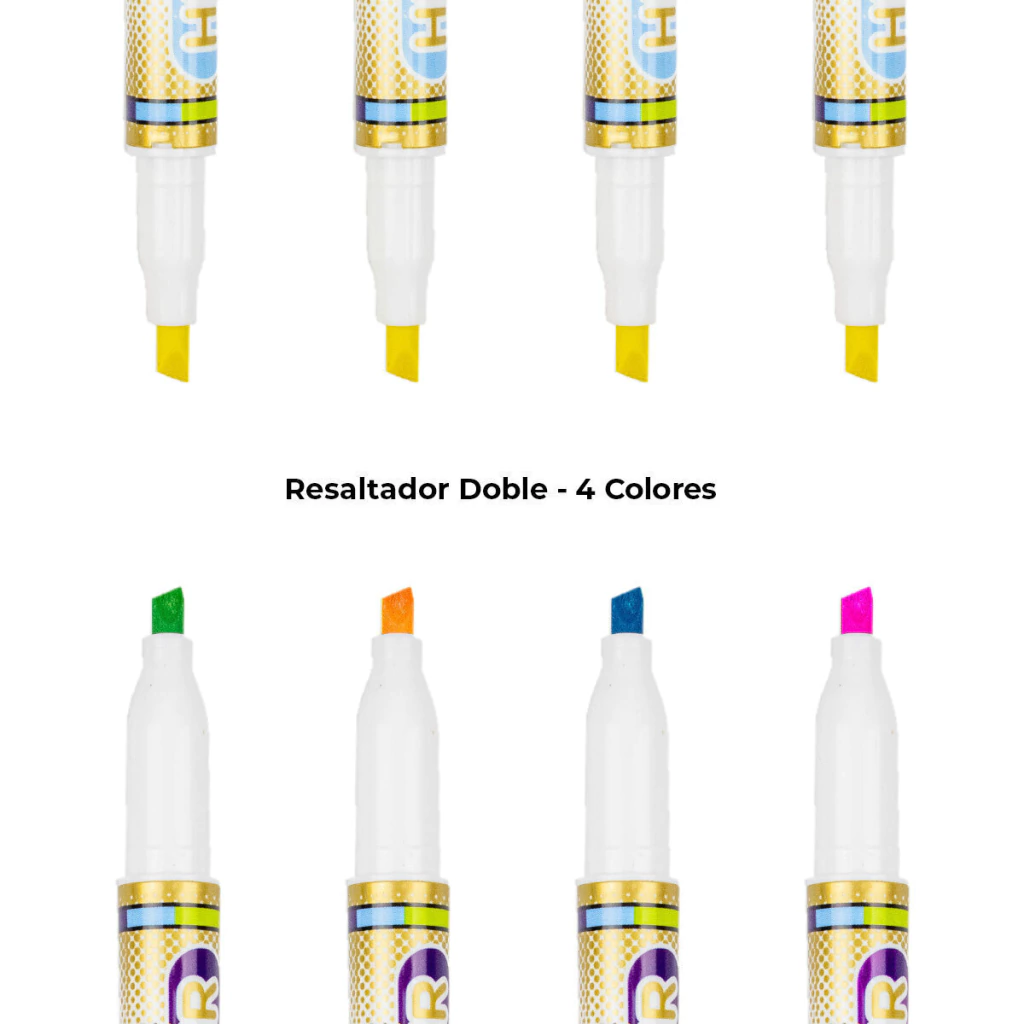 - Estuche de plástico transparente que incluye 4 resaltadores doble de 4 colores (verde, naranja, rosa y celeste) de 1 extremo y amarillo del otro extremo.